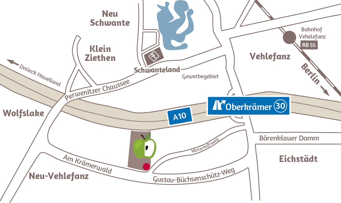 Über die Autobahn A 10 (Berliner Ring), Abfahrt Oberkrämer und in Richtung Vehlefanz fahren. An der Tankstelle links auf Perwenitzer Chaussee abbiegen. In Wolfslake links Richtung Neu-Vehlefanz fahren.